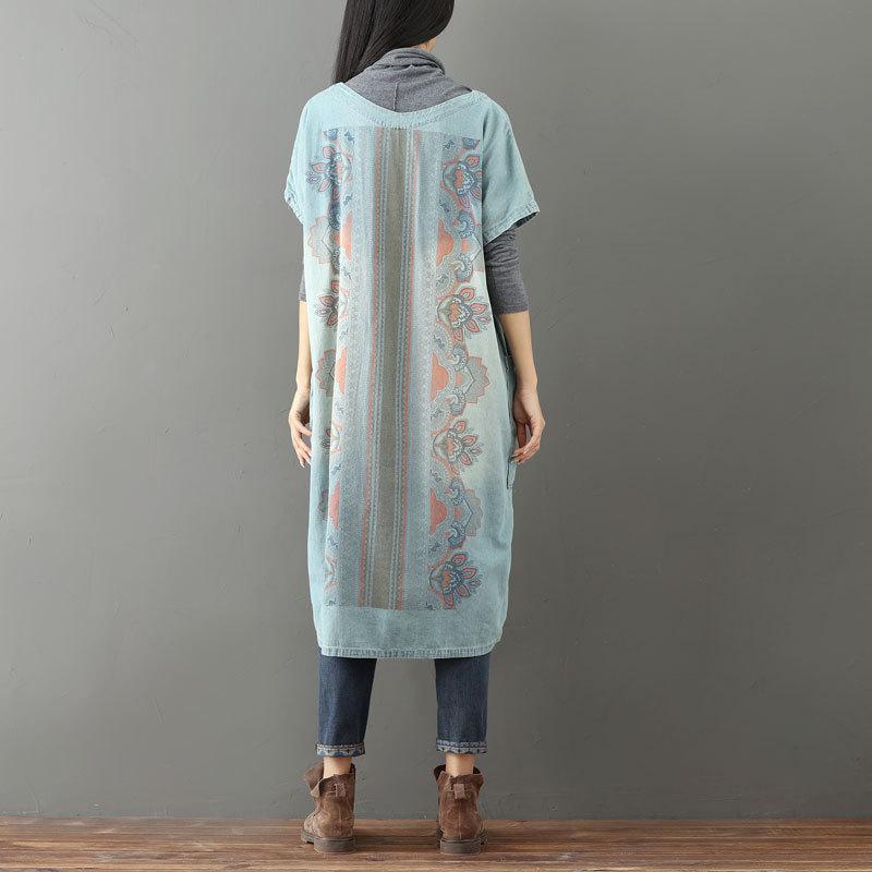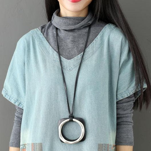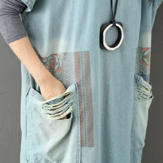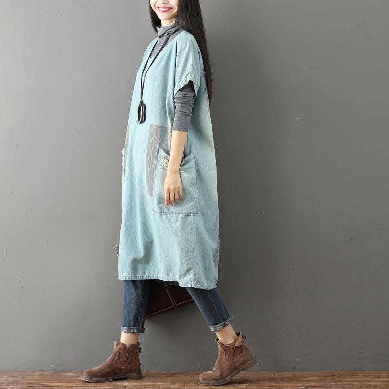This unique. long denim t-shirt dress is the perfect piece to convey the Artsy look!The loose fit allows you to move around comfortably and freely. Featuring a V-Neck cut and large pockets. you can keep your phone. keys. and wallet on you if you are in a rush and don’thave time to grab yourhandbag and just casually go about your day.Pair this denim dress with your favorite accessories. shoes. and bags. It’s very versatile to be worn on alone. with leggings or solid color bottoms.